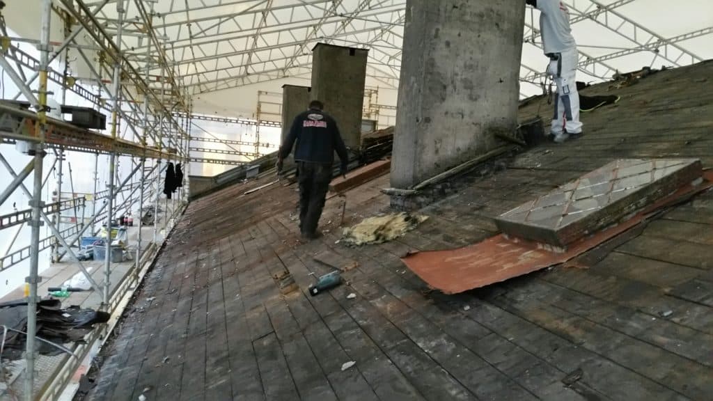 Råtne takbord er byttet ut, og ny diffusjonsåpen undertakspapp av type SIGA Majcoat SOB er lagt. Taket er lektet opp på nytt for å sikre god lufting i undertaket.