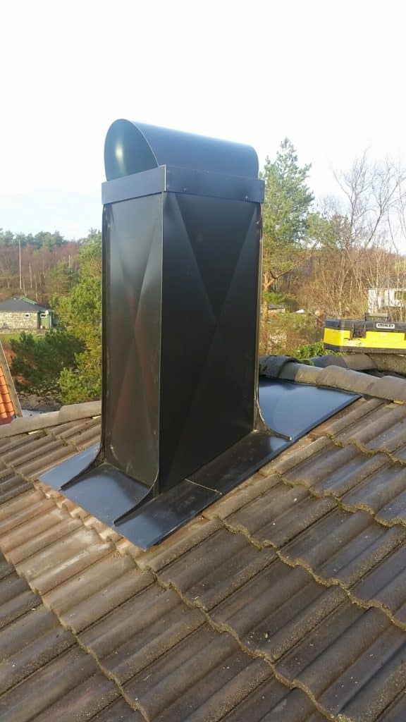 Pipen er beslått med sortlakkerte aluminiumsplater fra toppen og utover takstein.