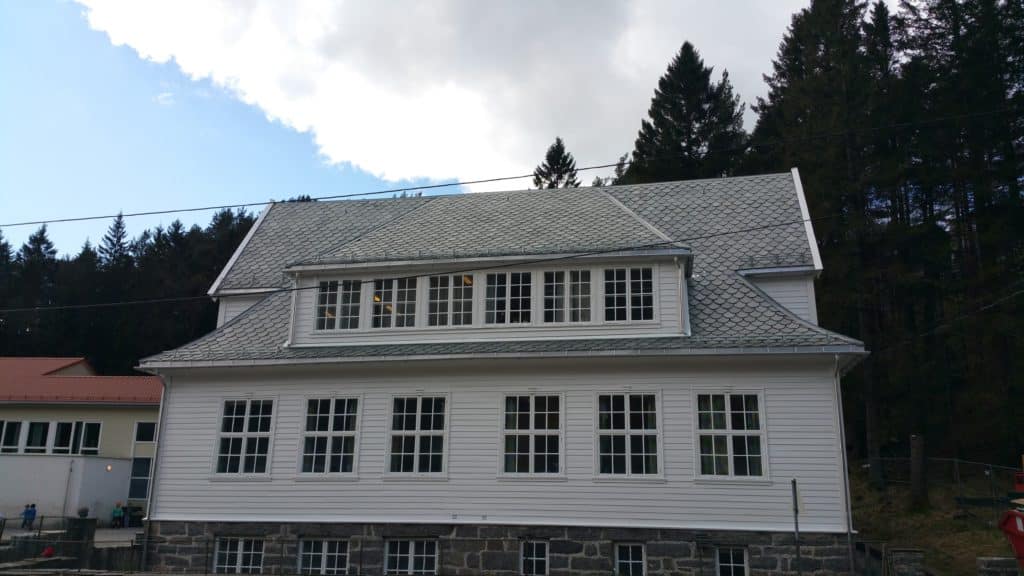 Eksisterende tak er demontert. Det er skiftet ut med nye impregnerte lekter, feder og sutaksplater. Nye valm- og gavelstein er levert og montert. Det er levert og montert nye sløysbeslag, skottrennebeslag, veggbeslag mm. Nye takhetter, takrenner og nedløp i aluminium, snøfangere er levert og montert.